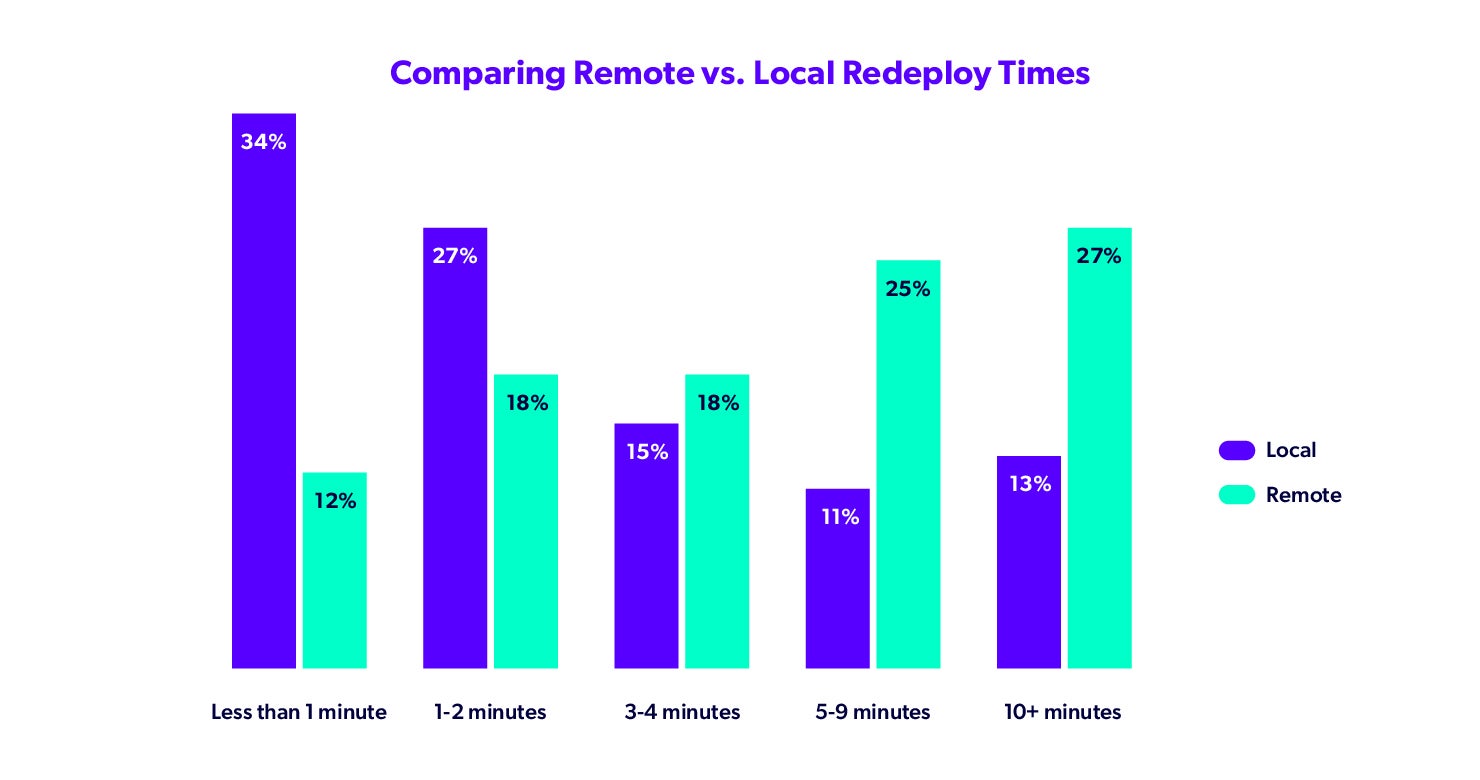 This year’s data on remote redeploy times are alarming, with 27% of developers waiting more than 10 minutes, and 25% somewhere between five to nine. That means more than half of all developers spend at least five minutes on every remote redeploy.