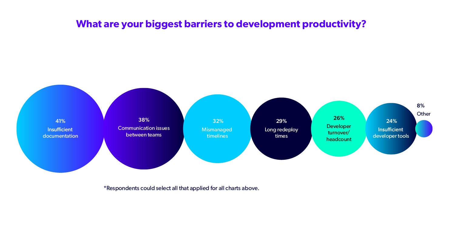 Insufficient documentation, communication issues, and mismanaged timelines top the list of biggest barriers to development productivity. Notably, nearly one in three developers cite long redeploy times as a challenge.